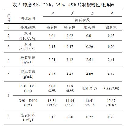 由表1結合圖1可知,反應時間2min、4min制備得到的原始銀粉主要以團聚體形式存在,而反應時間6min、8min則主要以花簇狀團聚形式存在。同時可以看出反應4min制得的原始銀粉其粒徑大小、振實密度適中;2min制得的原始銀粉振實密度小,比表面積大,吸油量大,不適用于高振實高銀含量的導電膠體系;反應6min和8min制得的原始銀粉,其粒徑大,球磨制得的片狀銀粉粒徑在10μm以上,雖然其均表現出較高振實密度,但是其在連續(xù)點膠或絲網印刷等施膠過程中會存在堵孔或網的問題,影響連續(xù)施膠。因而,我們選用反應4min制得的原始銀粉進行后續(xù)球磨實驗。表1反應2min、4min、6min、8min原始銀粉性能指標