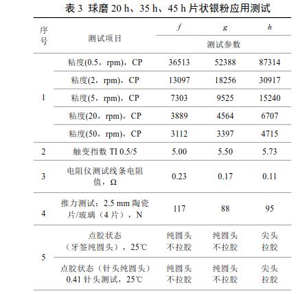 由表3可知,球磨20h、35h片狀銀粉制得IC封裝導電銀膠點膠效果好,無明顯拉膠現象;45h的制得導電銀漿點膠存在尖頭和拉膠現象。同時可以看出,20h的片狀銀粉觸變指數低,導電銀膠需要有良好觸變特性便于點膠;45h的片狀銀粉觸變指數高;而且可以看出35h、45h制得的導電膠的線條電阻值較小。這三款產品推力測試、固化后硬度測試、高低溫冷熱沖擊測試及高溫高濕測試均滿足應用。綜合上述各項指標,球磨35h制得的片狀銀粉制得的導電銀膠均達到了應用指標要求。